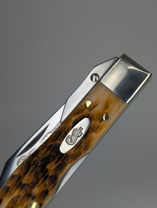 Case Knives Amber Bone Peach Seed Jig Cheetah Cub Back Lock Folding Knife
