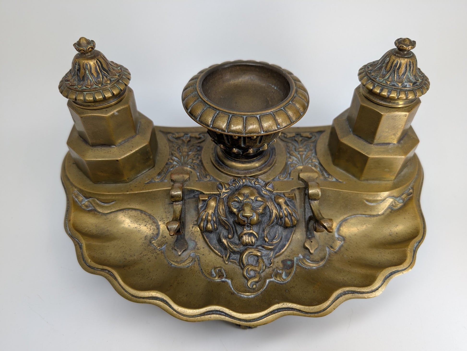 The inkwell/pen rest exhibits normal patina, a natural result of age and use that adds to its character and charm. The patina tells a story, offering a glimpse into the past and enhancing its antique appeal.