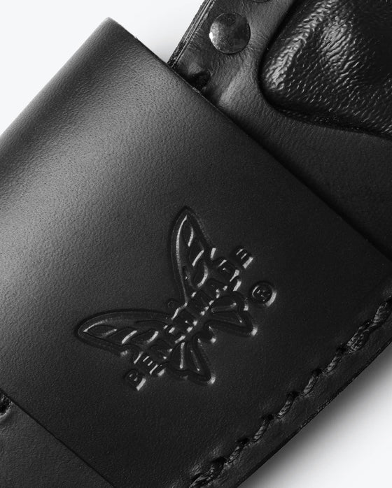 Purpose-built for everyday carry, the 203 Dacian™ Sheath in black leather combines rugged full-grain cow leather with a molded black Boltaron® insert for durable protection and secure retention of the Dacian™ fixed blade. Hardware-based locking provides a consistent, confident draw every time. Designed for ambidextrous scout carry, the sheath can be worn on either the right or left side, sitting horizontally along the beltline for added comfort while bending, sitting, or moving through the field. Its low-profile orientation offers improved concealment—especially when wearing an untucked shirt—while reducing the chance of catching on gear, clothing, or brush. Finished in black for a sleek, utilitarian look that’s built for real-world use.