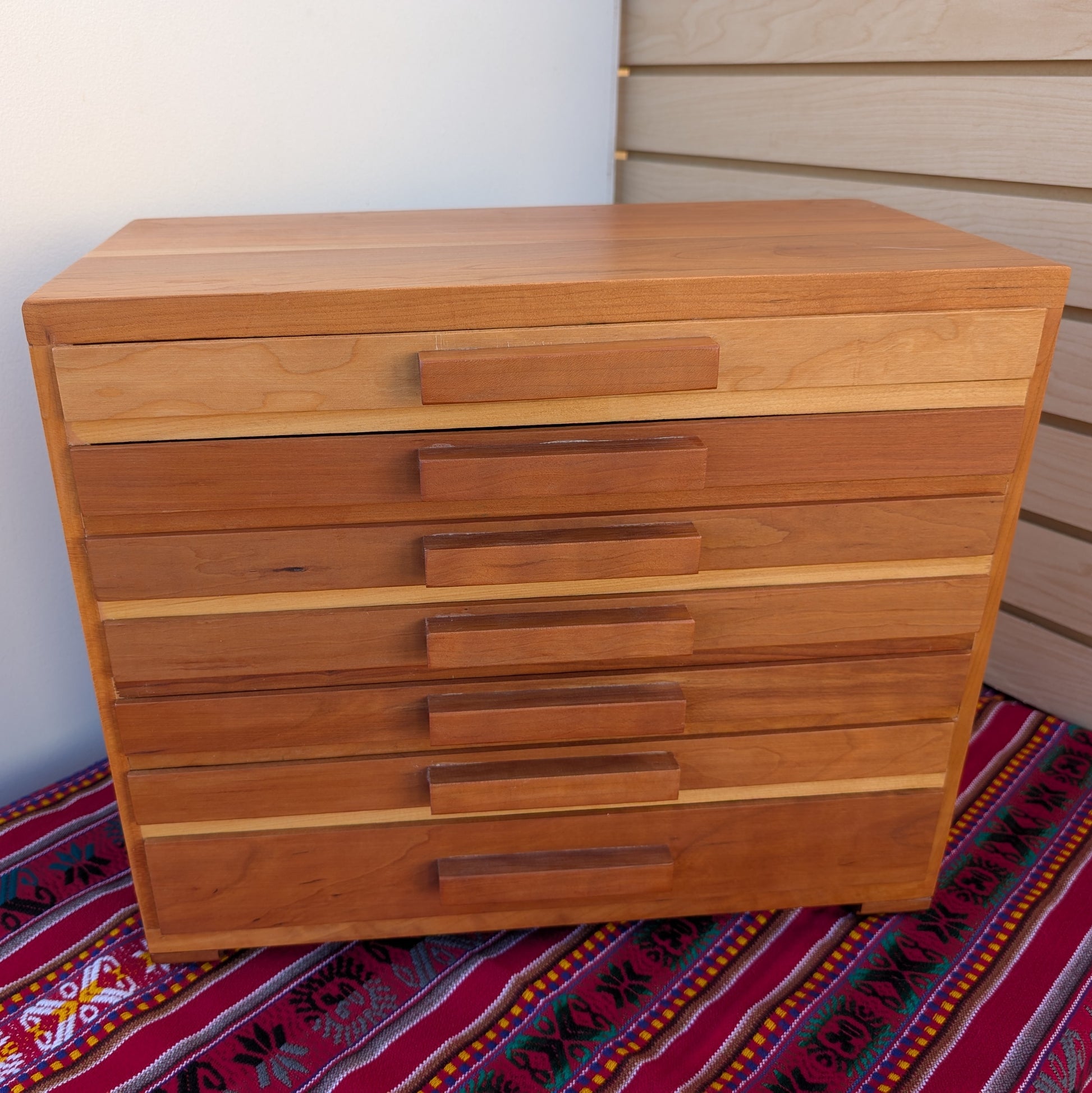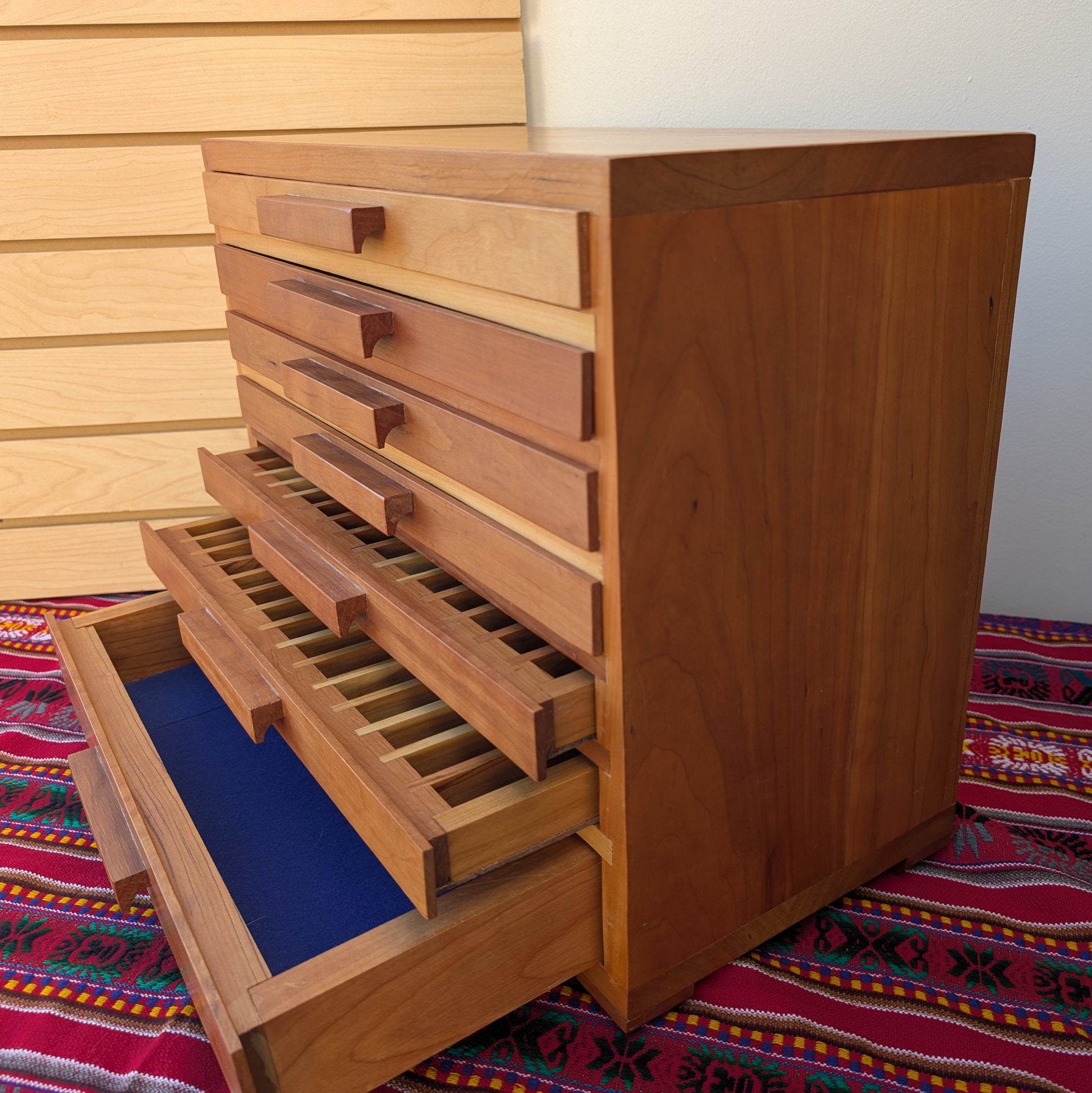 Solid Cherry wood pen box, with a bottom drawer for supplies.