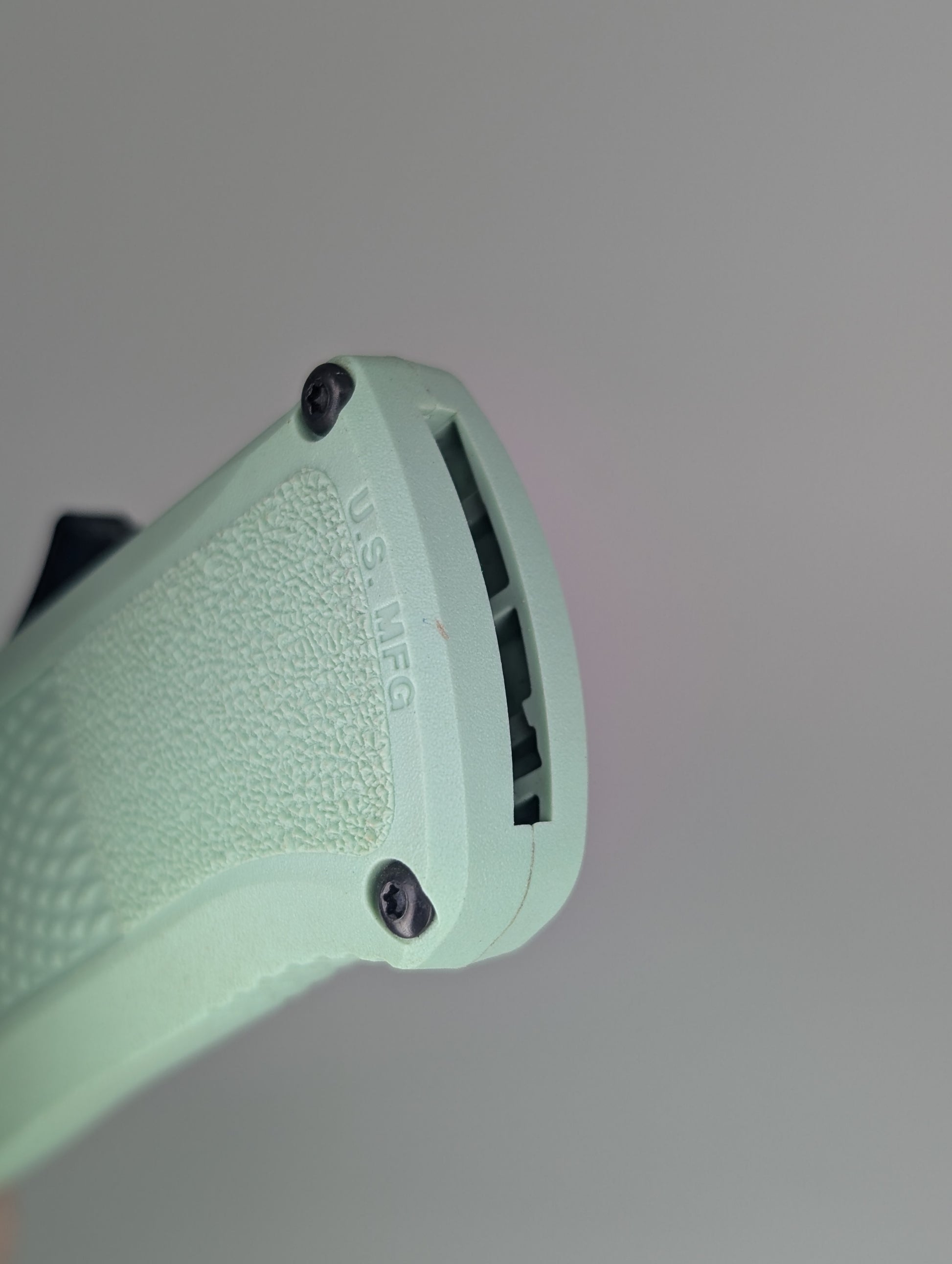 The Benchmade Shootout is a Benchmade OTF knife with some seriously great attributes. It features a lightweight Sea Foam Green Grivory handle with a reversible pocket clip and a CRU-WEAR super steel blade with a PVD finish.