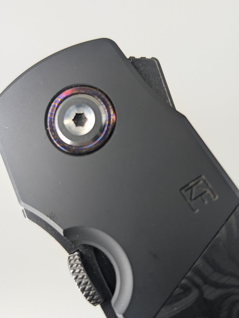 his Eagle Rock linerlock is from Custom Knife Factory and designed by Bob Terzuola. It features a tumble finish multi-ground blade with fullers and false top edge, notched thumbrest and a thumbdisc. The handle has Timascus pivot collars, stonewash bolsters, carbon fiber scales, stonewash titanium liners, stonewash backspacer, tip up titanium clip. Nice blade seating, detent, and lockup. Excellent work. Comes with a zippered case. Excellent condition.