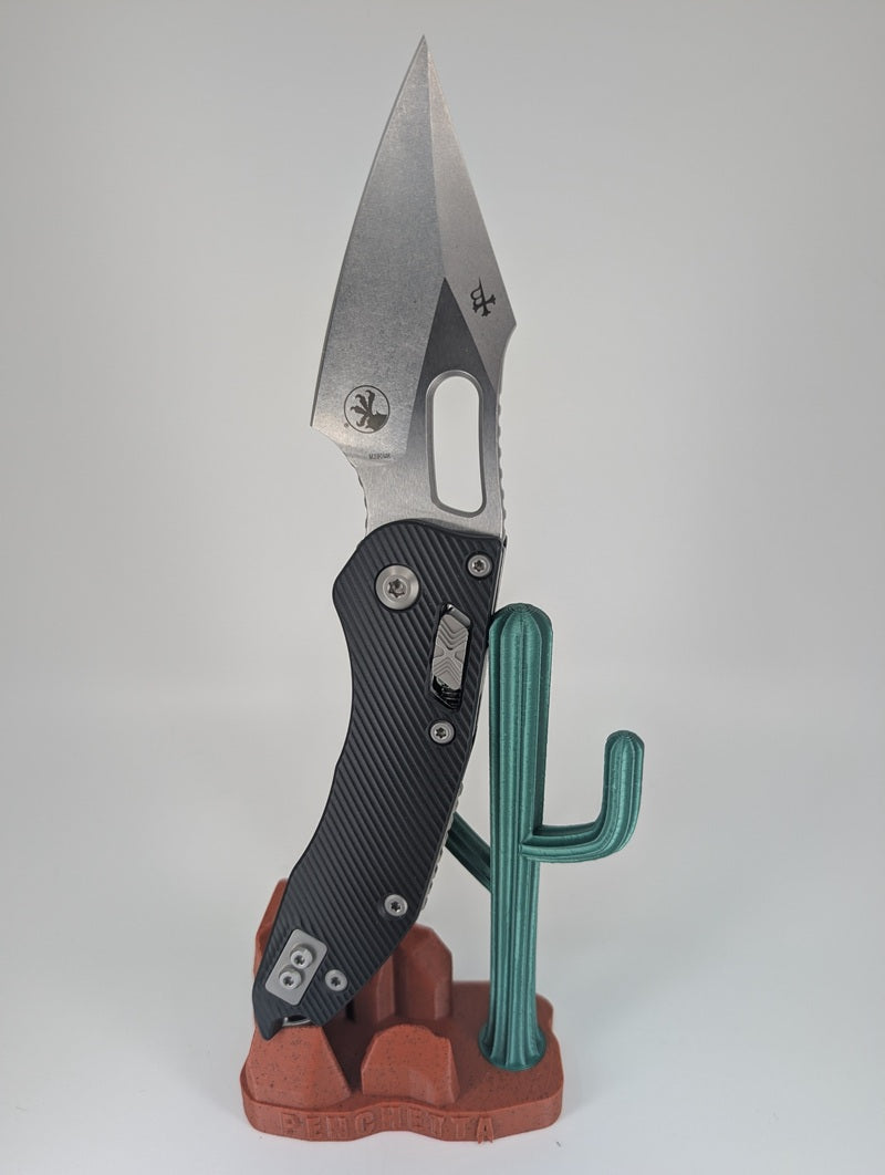 The Microtech Stitch Ram-Lok is Microtech's exciting new take on the beloved Stitch Automatic. It boasts Microtech's exclusive Bohler M390MK steel blade, offering improved edge retention over standard Bohler M390 steel. The knife employs the Ram-Lok, not too dissimilar from a crossbar lock, for tight blade lock-up, easy one-handed closing, and tremendous strength; to disengage the lock, simply pull away from the blade on the X-Buttons. The handle features lightweight scales over steel liners with a titanium backspacer. Take on any cutting task with the manual Stitch!