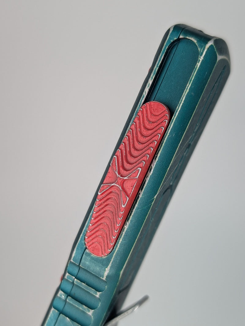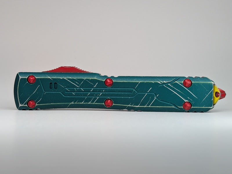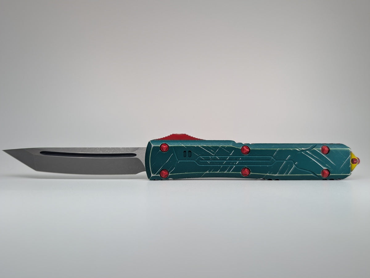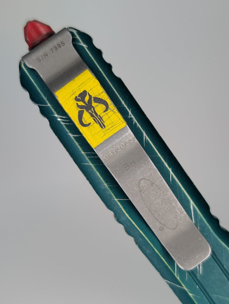 The Ultratech without question has been Microtech's flagship out the front auto knife since its induction in 1999. Each Microtech OTF knife has extremely sophisticated internal mechanisms which improve the overall operational functionality and reliability. This special limited model, the 123-10BH, features a green distressed handle complete with unique red distressed hardware, a pocket clip with a yellow Mandalorian skull graphic and an integrated glass breaker function along with a tanto style blade in an apocalyptic stonewash finish. Furthermore, the blade also includes satin flats and a black finished blood groove. Made in the USA.