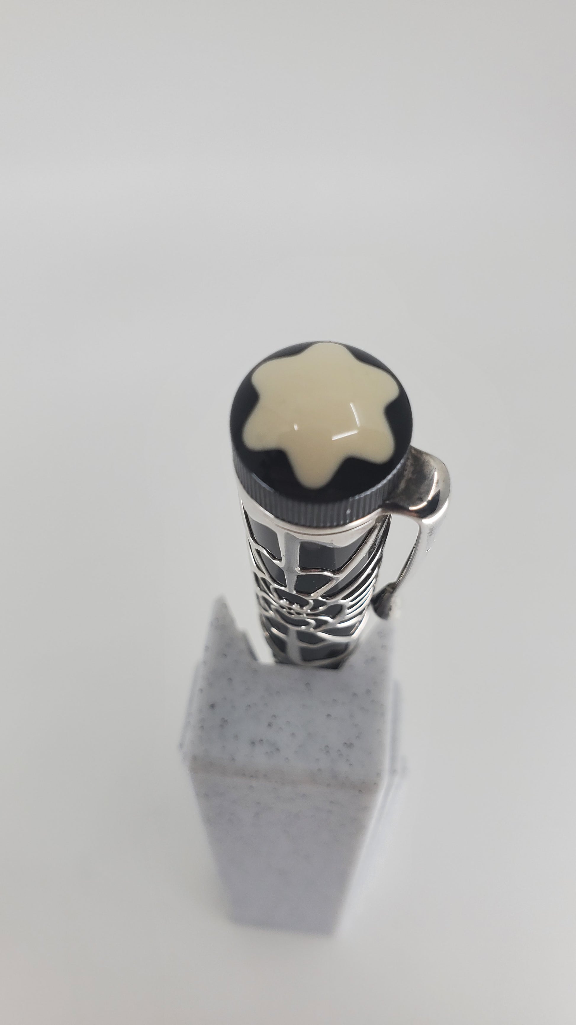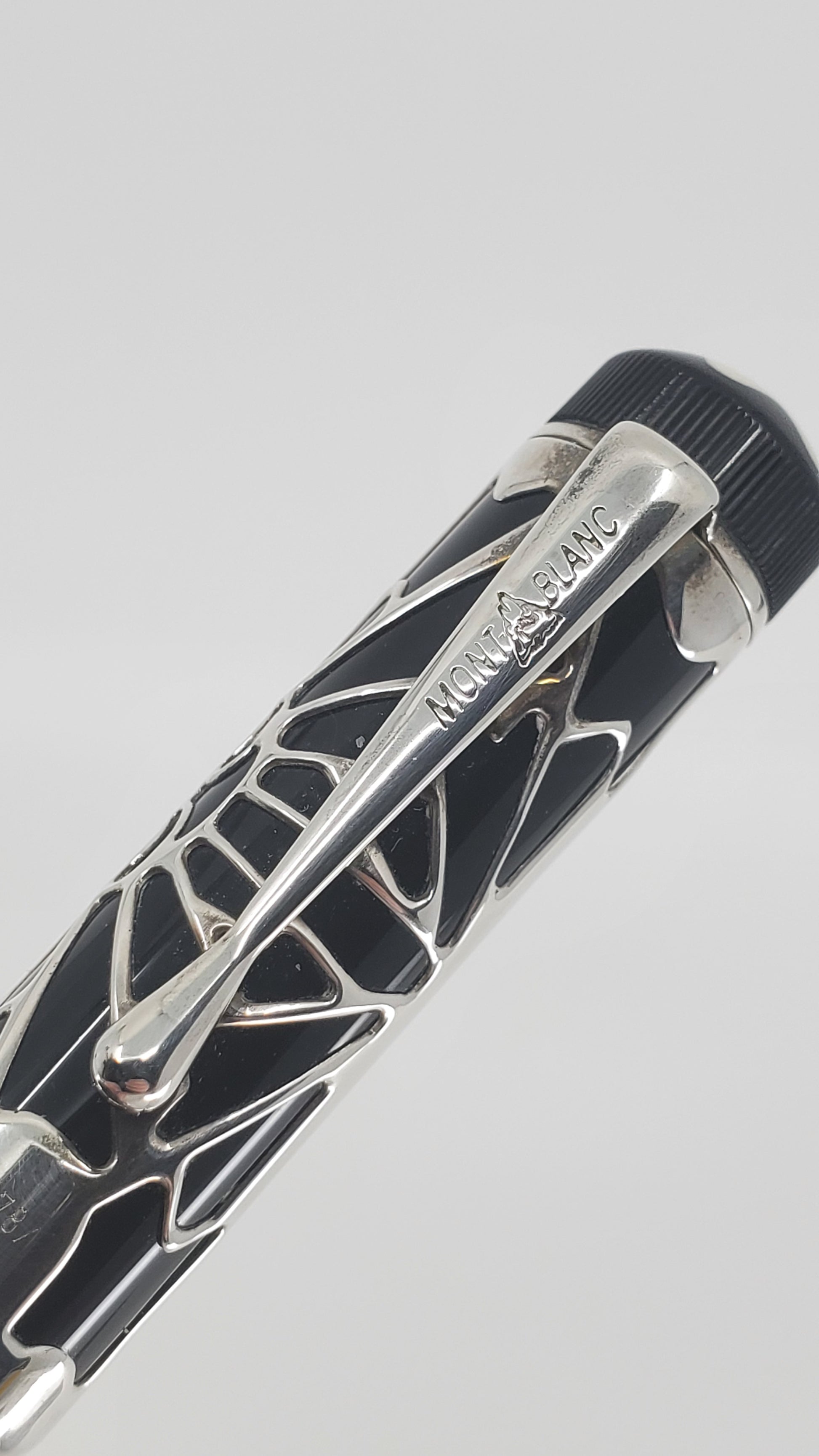 Gaius Octavian, honored by the Roman Senate with the name Augustus, was the driving force behind the cultural revival of the epoch that followed numerous years of war. He brought years of peace, artistic development, and cultural renaissance to Rome. Because of his support for the construction of splendid public buildings, which made Rome a city of marble and a powerhouse of artistic and intellectual endeavor, his name is forever connected with the heyday of the Roman Empire. The fascinating spider’s web design of the Patron of Art Edition Octavian is adapted from a design typical of the 1920s and also recalls the emperor’s elaborately woven network of power. In the middle of this web of delicate Ag 925 sterling silver threads, which covers the gleaming black barrel and the precious resin cap, sits an artistically shaped, stylized spider. The handcrafted rhodium-coated Au 750 Medium (M) solid gold nib also bears a delicately engraved spider.
