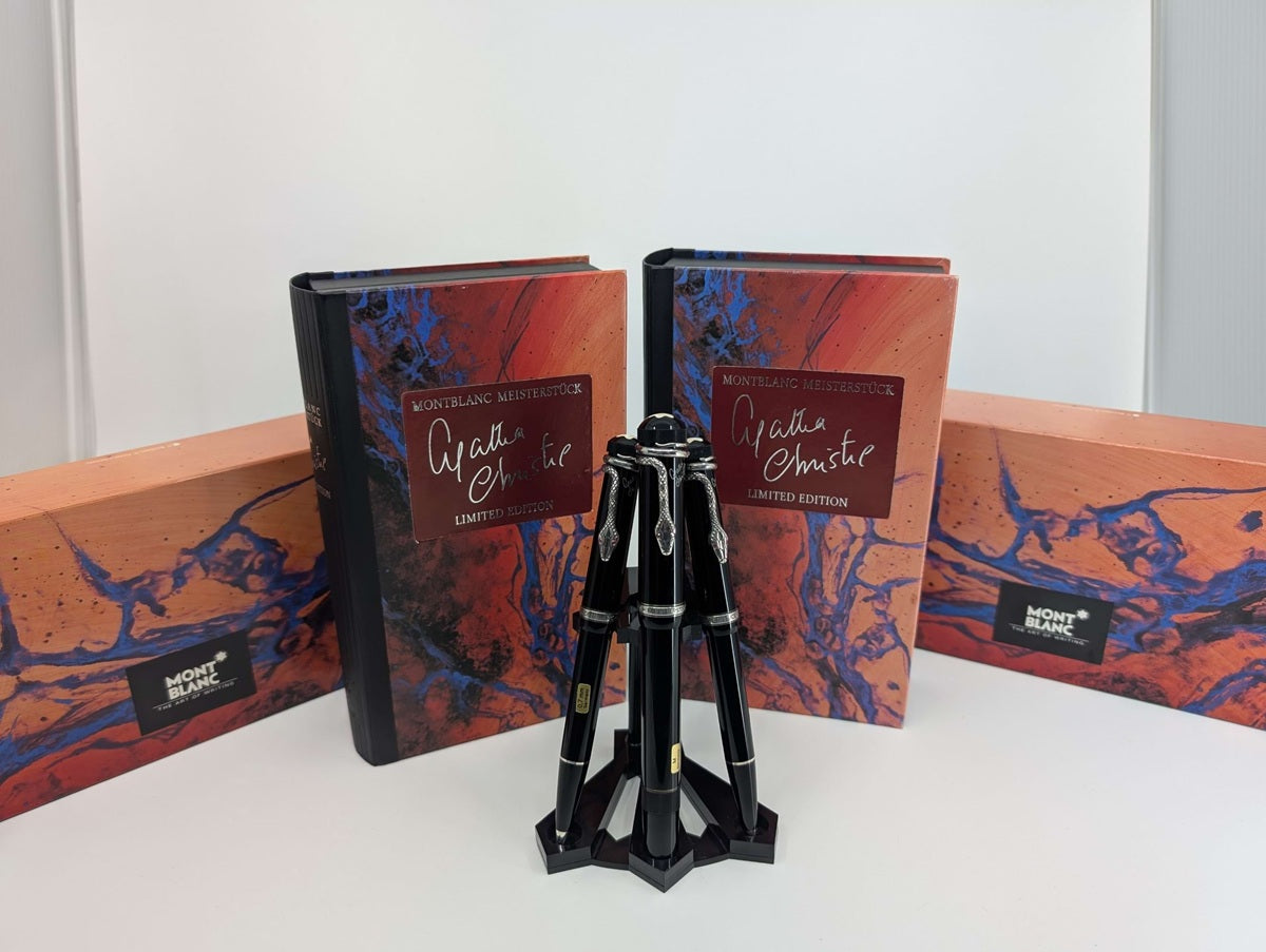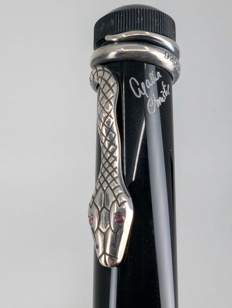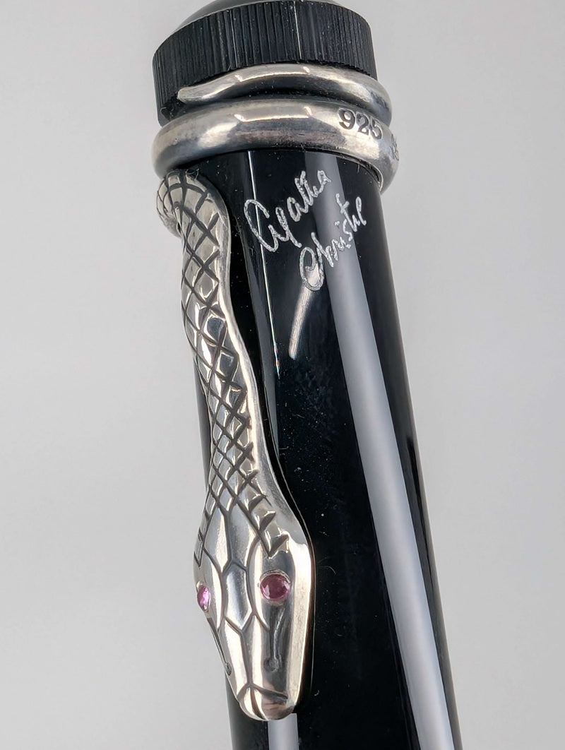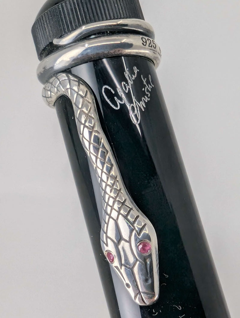 This Agatha Christie Set consists of: Fountain pen, ballpoint, mechanical pencil (0.7mm). Agatha Christie captivated millions of people all around the world with the clever narrative style and brilliantly constructed plots of her novels, plays and short stories. The design of this Writers Edition, created in 1993 in honor of Agatha Christie, is based on the classic style of an early 1920s MB fountain pen (1920 is also the year in which Agatha Christie’s first novel The Mysterious Affair at Styles, was published). Around the cap, made of precious black resin, winds a snake made of 925 sterling silver, which alludes to the mounting tension of the Authors novel and serves as the clip of the pen. The eyes of the snake are set with two ruby that glint bewitchingly. The head of a snake is also engraved on the rhodium-plated 18k 750 gold nibs. Each Agatha Christie Writers Limited Edition pen is decorated with the signature of the Grande dame of the crime novel. Number 06015 out of 7000.