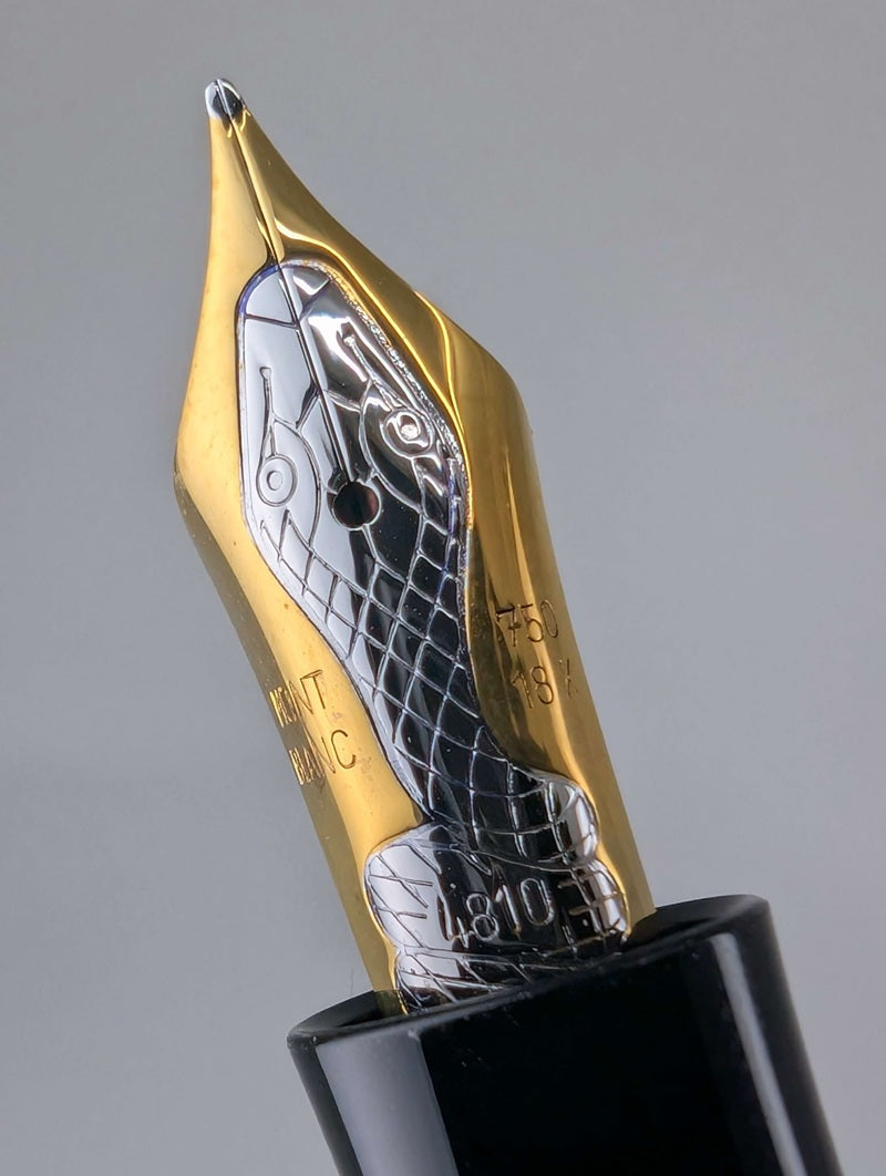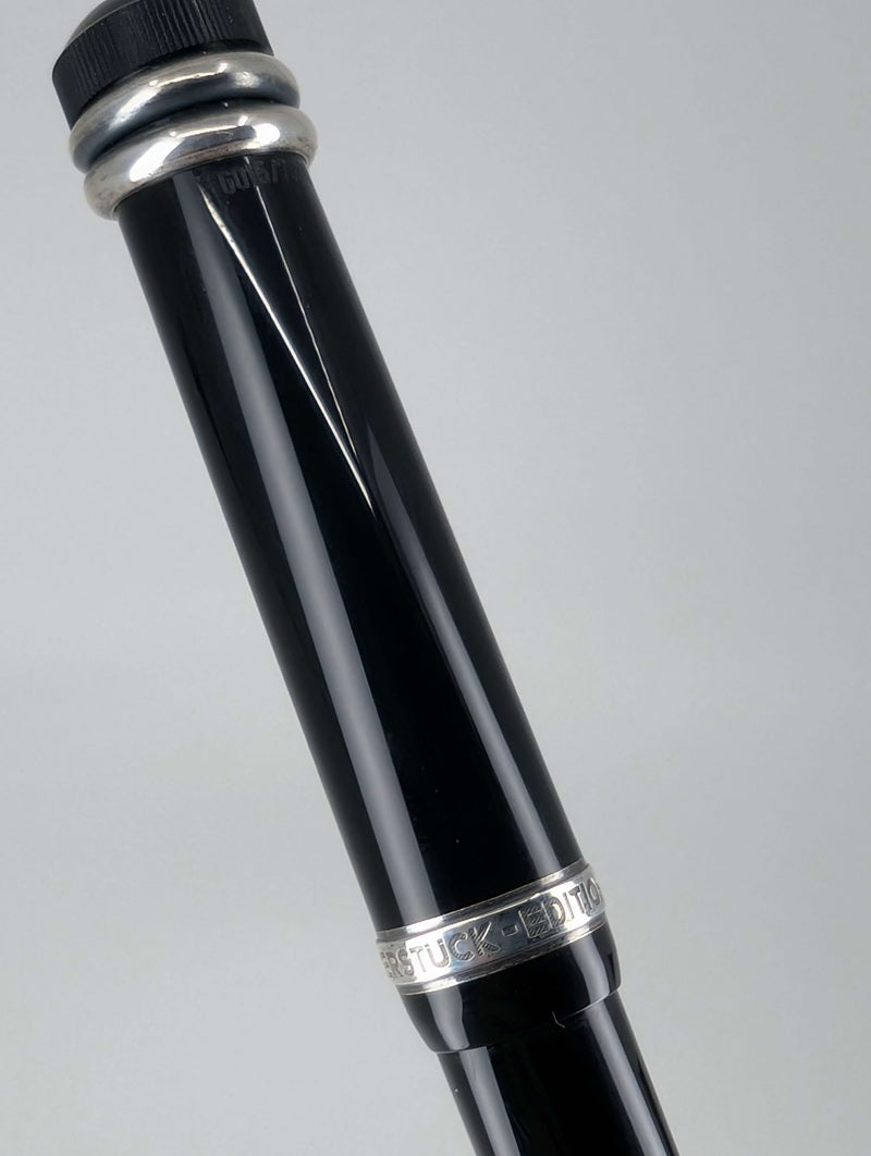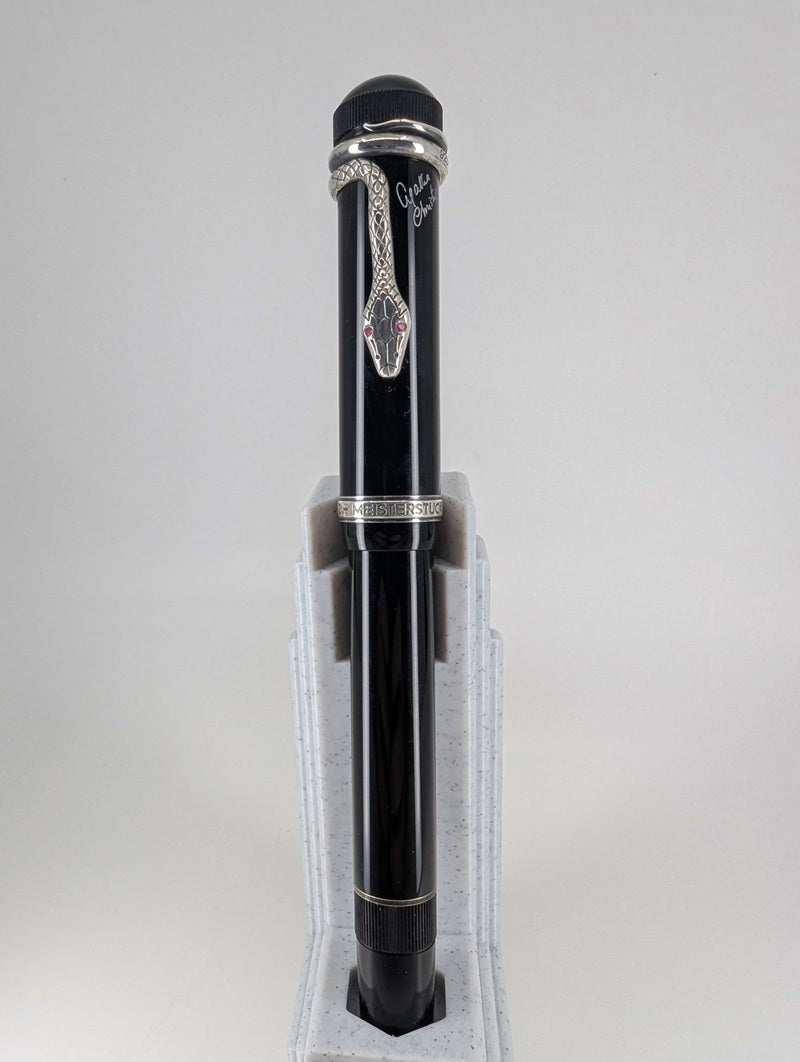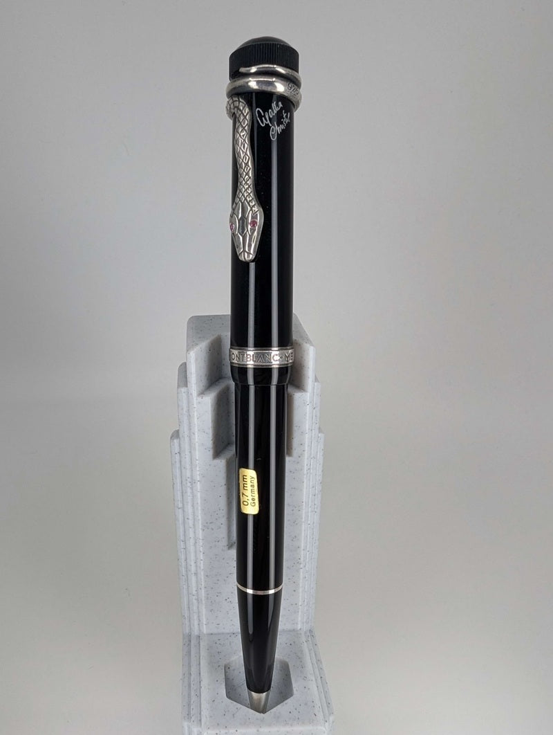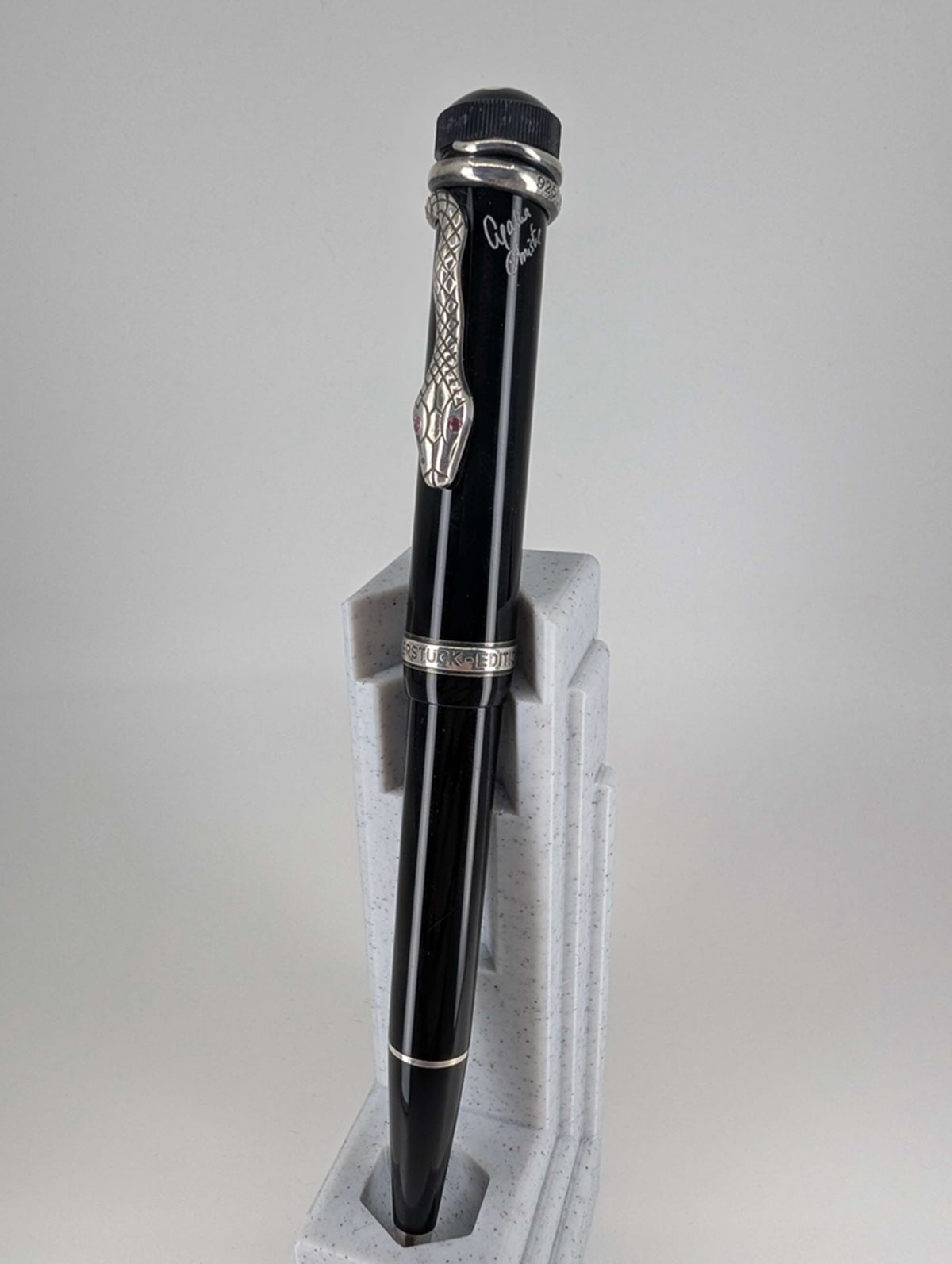 This Agatha Christie Set consists of: Fountain pen, ballpoint, mechanical pencil (0.7mm). Agatha Christie captivated millions of people all around the world with the clever narrative style and brilliantly constructed plots of her novels, plays and short stories. The design of this Writers Edition, created in 1993 in honor of Agatha Christie, is based on the classic style of an early 1920s MB fountain pen (1920 is also the year in which Agatha Christie’s first novel The Mysterious Affair at Styles, was published). Around the cap, made of precious black resin, winds a snake made of 925 sterling silver, which alludes to the mounting tension of the Authors novel and serves as the clip of the pen. The eyes of the snake are set with two ruby that glint bewitchingly. The head of a snake is also engraved on the rhodium-plated 18k 750 gold nibs. Each Agatha Christie Writers Limited Edition pen is decorated with the signature of the Grande dame of the crime novel. Number 06015 out of 7000.