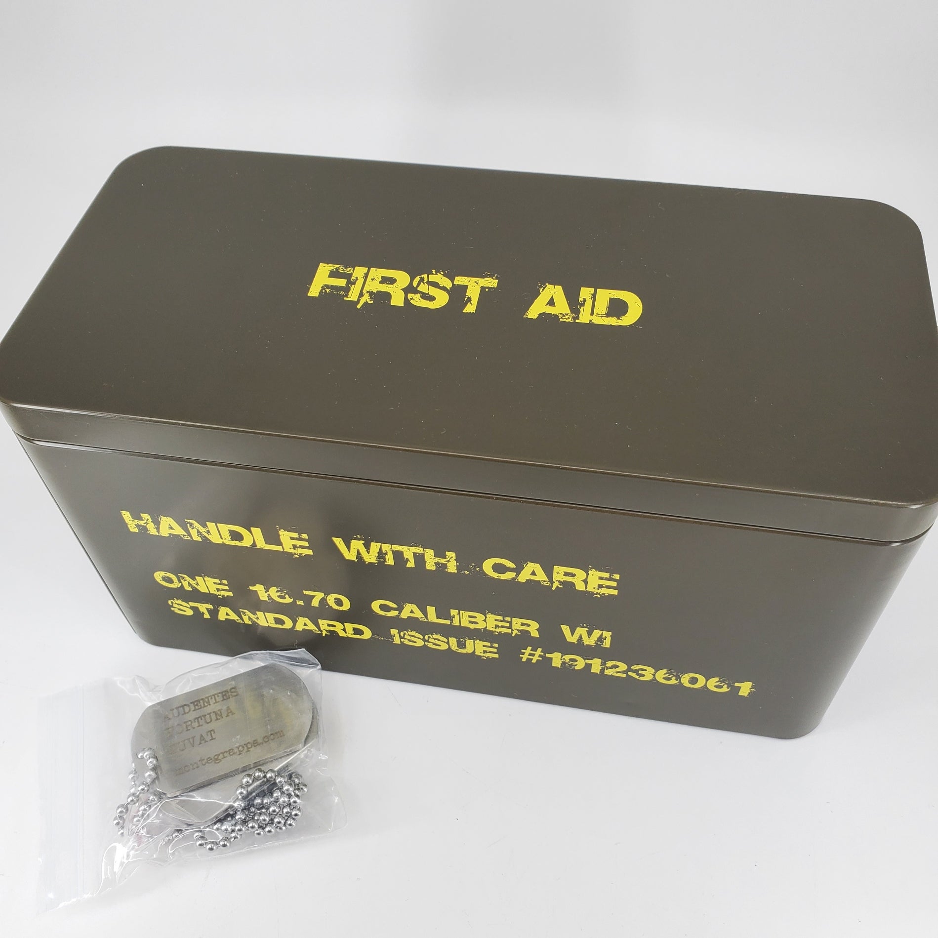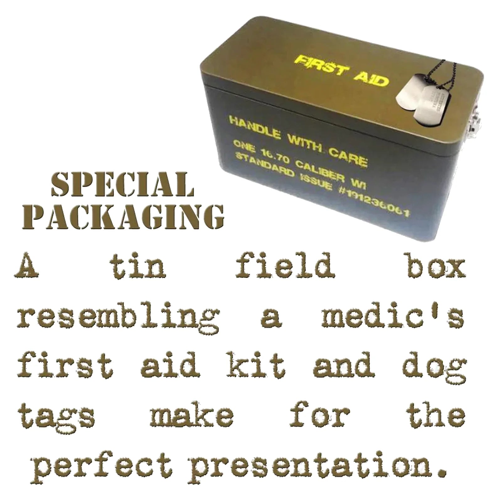 As with any military issue, the accessories are a major part of the experience. Every Camouflage pen is supplied in a tin field box, resembling a medic’s first aid kit, and the set comes with dog tags and a special key-ring, bearing a “military” target. If you’re in touch with your inner Rambo, this pen has your name – and serial number – all over it.