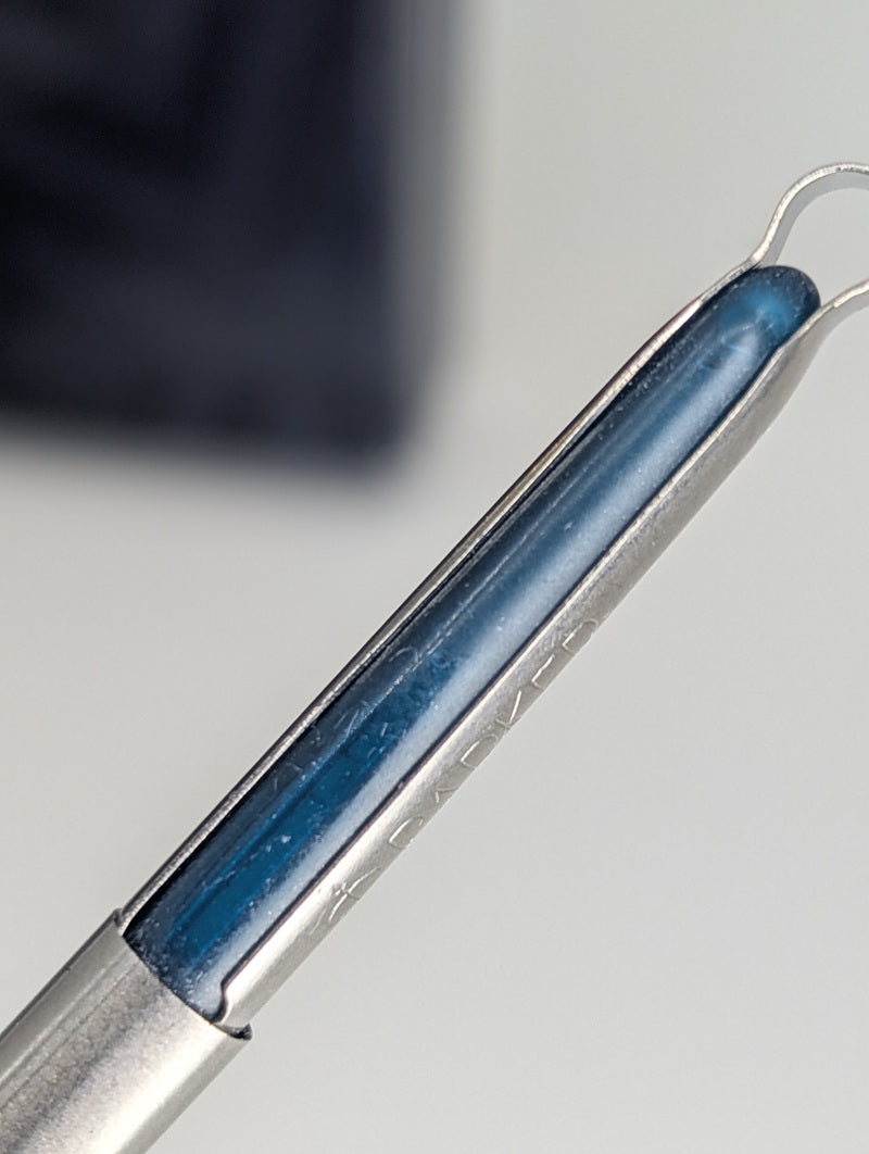 Accompanying the ballpoint is a Parker 45 Fountain Pen. This pen shows some signs of use, most notably a scratch on the cap. Despite this cosmetic detail, the fountain pen remains a functional and elegant writing instrument, ready to deliver a satisfying writing experience.