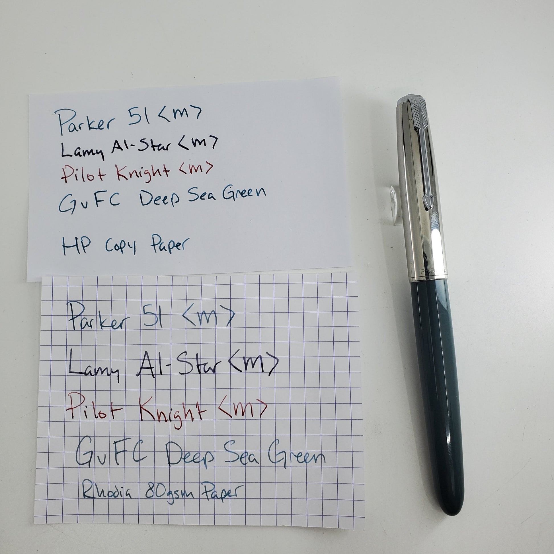 The pen is gently used, it writes great (see our comparison pic) and is ready to serve.