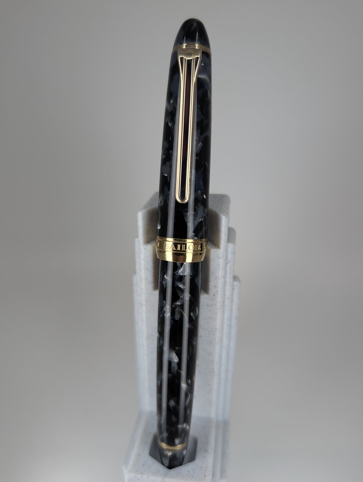 This is the Sailor 1911 Mosaic fountain pen. It has a black resin that has a mosaic pattern to it with chrome accents throughout. On the both the ends of the pen it has a rounding shape transitioning into a pointed shape at the ends. On the top of the cap is a small gold band that runs around the pen with a chrome clip. It is a simple crime clip that has a little bit of a flare there at the end with a ball shape. Then it has a nice large gold band that runs around the bottom the cap. Engraved into that gold band a sailor Japan founded in 1911. Then at the very bottom of the pen, at the bottom of the barrel is a small gold band once again. The cap on this pen unscrews and inside we have a black resin grip section with another small gold band and a 21 karat gold nib. On that day we have engraved 1911 with the Sailor anchor logo.