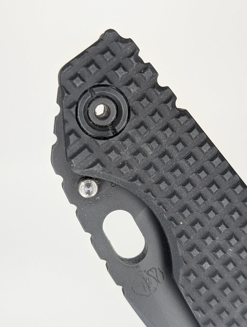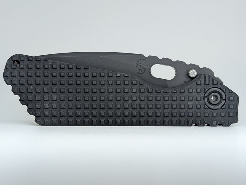 The Strider SMF was initially developed for a military unit that required a tough-as-nails knife in a folding package. This latest SMF has been updated and improved to be better than ever! The SMF has a full titanium frame lock that provides a stronger lock-up than some fixed blades. The 'standard' SMF is the profile Strider provides to the military. Simplified frame design has frame hardware screwing directly into non-lock side frame. Speaking of which, on this variation the standard G10 frame side is replaced with a solid aluminum scale with some killer Monkey Edge FRAG Pattern and a hard anodized finish.