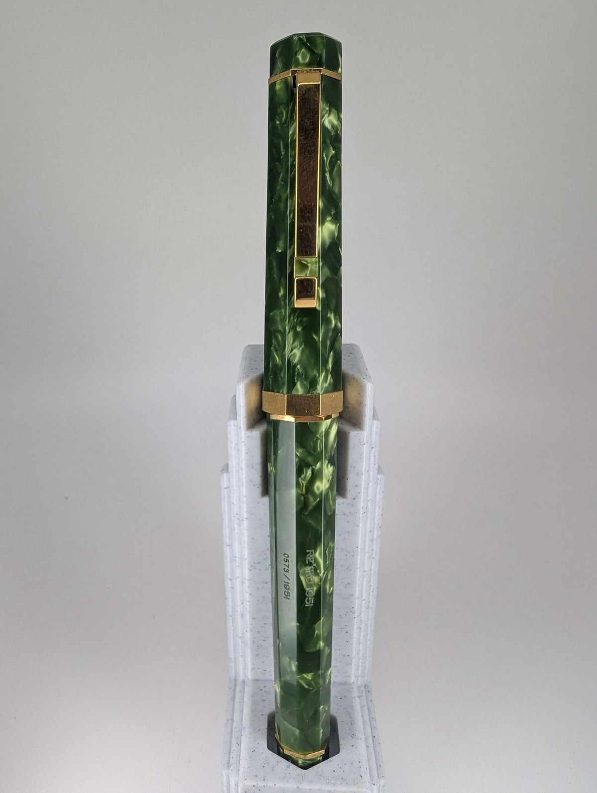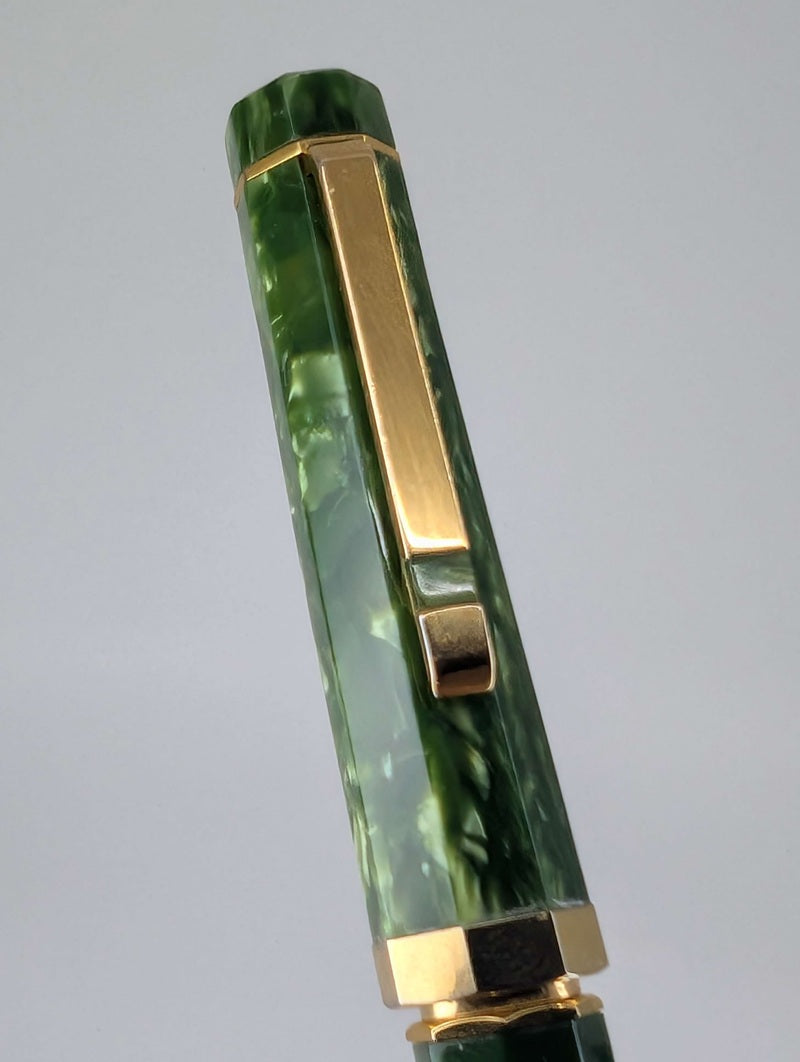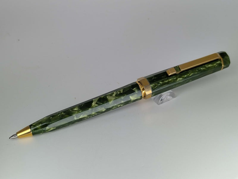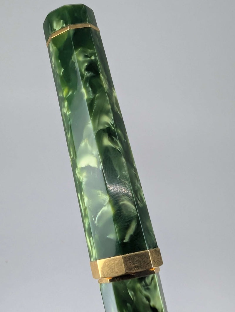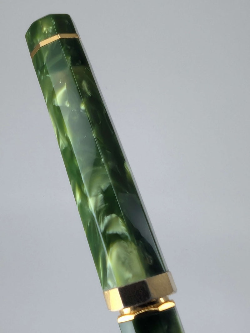 Inspired by the Chinese belief that eight is the most fortuitous of all numbers, the Retro 51 Double Eight has a classic octagonal barrel with double rings for elegance and harmony. The barrel is painstakingly prepared from solid bars of cellulose acetate, a natural substance that is favored for its strength, beauty and warm feel. The fountain pen has a German-made iridium nib and uses cartridges or converter. The clip and eight-sided rings are plated with platinum on the Calico Brown or Mineral Blue finishes. The Jade Green and Galactic Black have gold-plated trim.