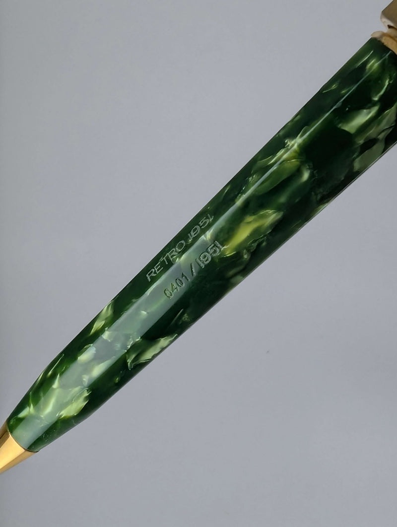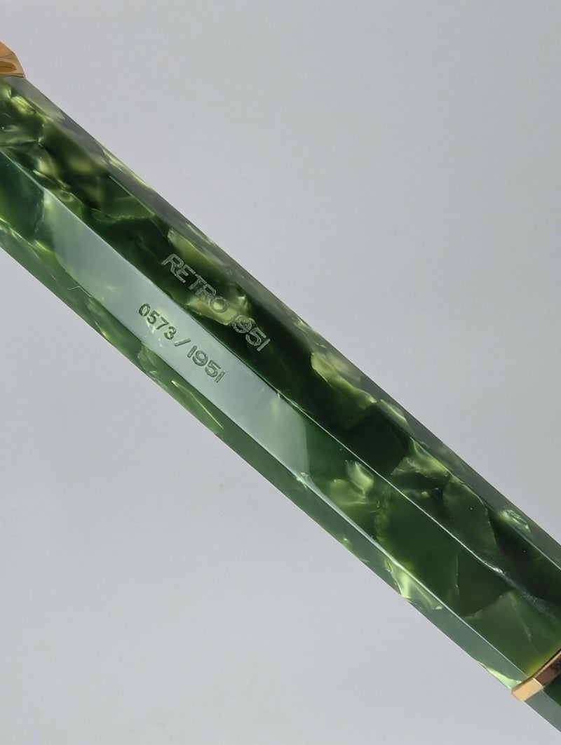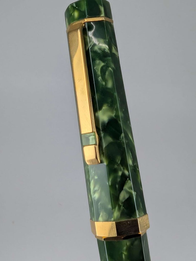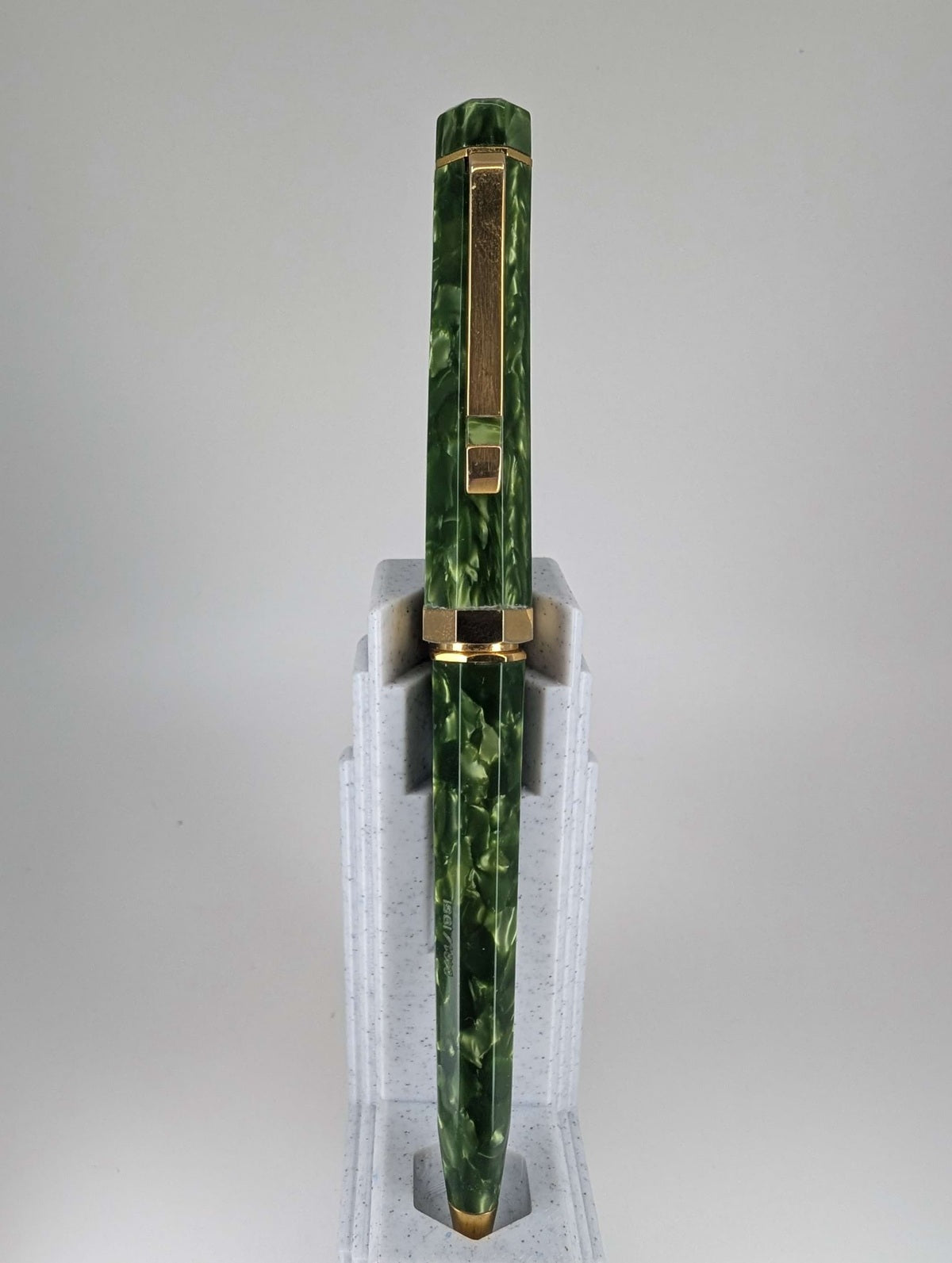 Inspired by the Chinese belief that eight is the most fortuitous of all numbers, the Retro 51 Double Eight has a classic octagonal barrel with double rings for elegance and harmony. The barrel is painstakingly prepared from solid bars of cellulose acetate, a natural substance that is favored for its strength, beauty and warm feel. The fountain pen has a German-made iridium nib and uses cartridges or converter. The clip and eight-sided rings are plated with platinum on the Calico Brown or Mineral Blue finishes. The Jade Green and Galactic Black have gold-plated trim.