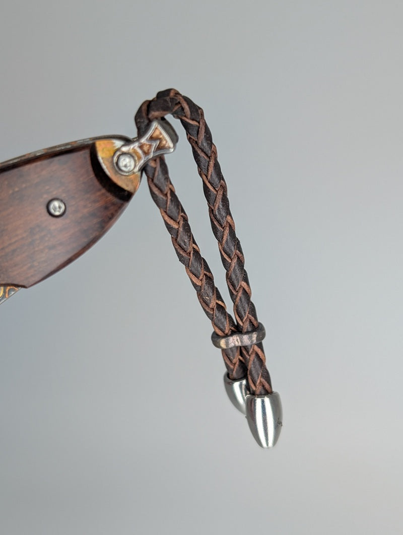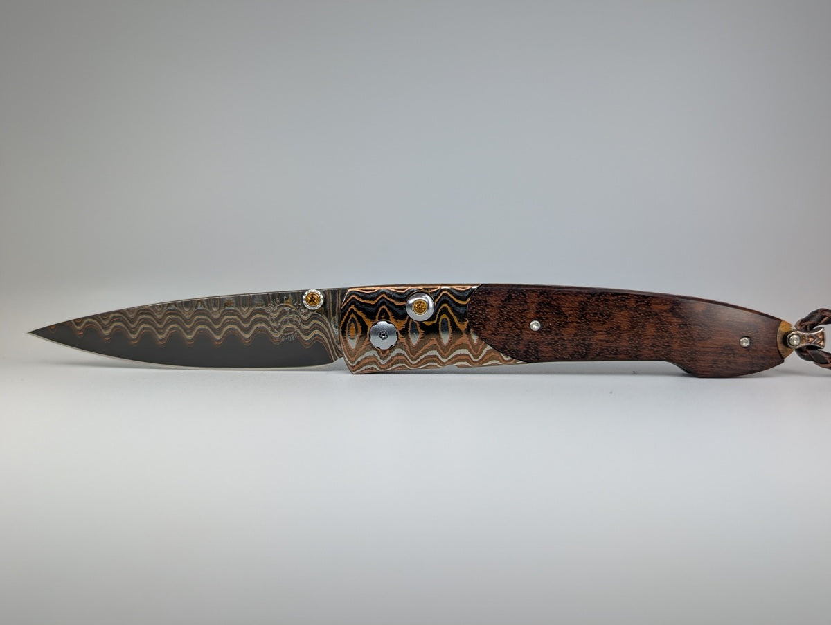 The Lancet 'Red Creek' features a beautiful frame in 'Wave' mokume gane, inlaid with snakewood. The blade is 'Copper Wave' damascus steel; the one-hand button lock and the thumb stud are set with citrines.