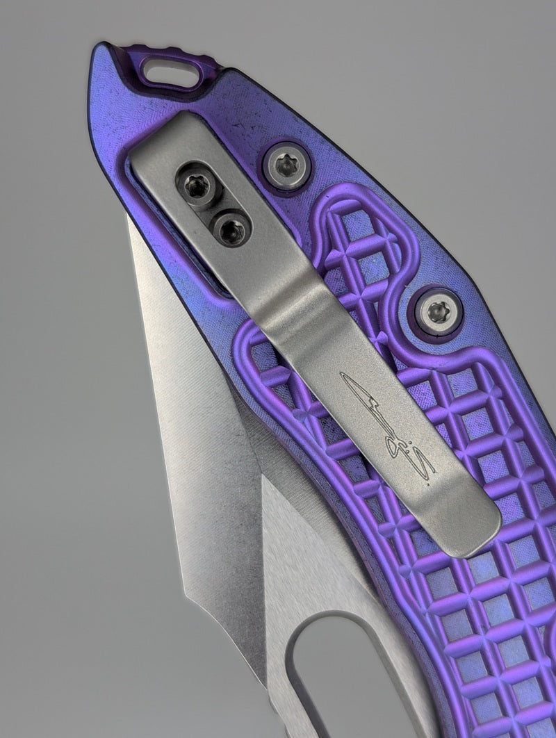 The handle uses Purple Haze anodized titanium in a frag pattern for grip and structural strength. Titanium accent hardware and double vapor-blast stainless components round out the design. This Marfione Select edition is USA-made and produced in limited quantities.