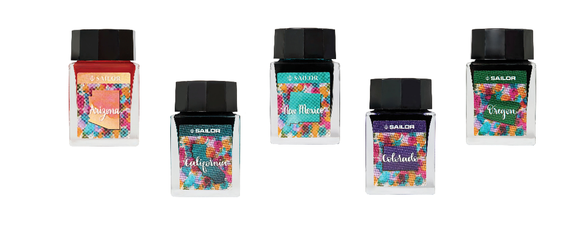 Sailor celebrates America with a new series of USA States inks. These colors are exclusive to North American Sailor Pen Dealers. Contained in 20ml square glass bottles, each color represents a memorable aspect of each state.
