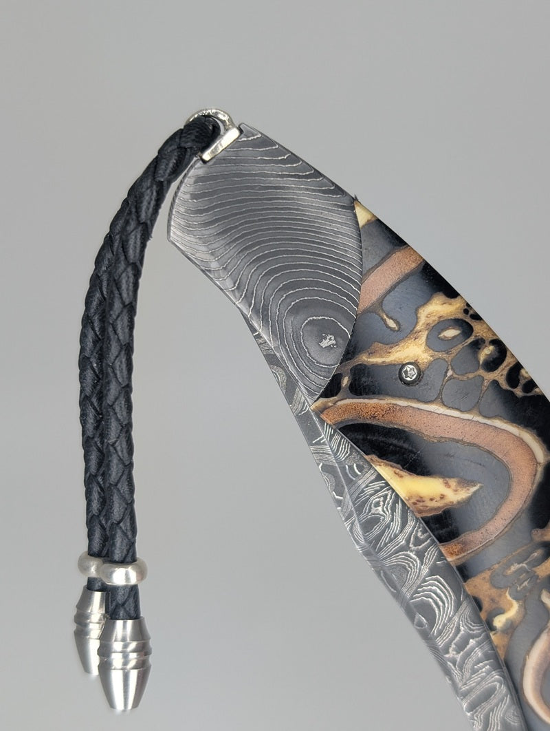 The Contour ‘Fernwood' features a frame in hand forged 'Twist' damascus steel by Chad Nichols, inlaid with Ponga Fern wood which grows only in New Zealand. The blade is hand-forged 'Hornets Nest' damascus by Mike Norris, and the one-hand button lock and the thumb stud are set with smoky quartz gemstones.