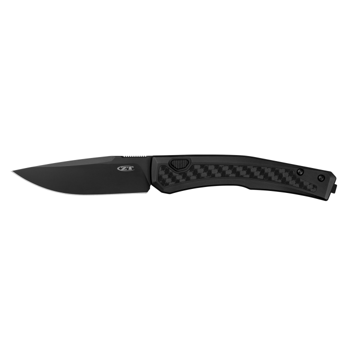 All business, all black. The 0556BLK takes the refined power of the original 0556 automatic and gives it a bold, monochromatic look. Both the CPM MagnaCut blade and titanium handle feature a jet-black PVD coating, elevated by a fine ceramic bead blast that creates a subtle metallic sheen. The result is a finish that’s smooth to the touch, visually deep, and undeniably ZT. Press the trapezoid-shaped button to experience rapid automatic action and reveal a precisely ground drop point blade built for cutting control. Lightweight carbon fiber inlays balance the titanium frame, combining strength and elegance in equal measure. From boardroom to backcountry, the 0556BLK carries authority in every detail.